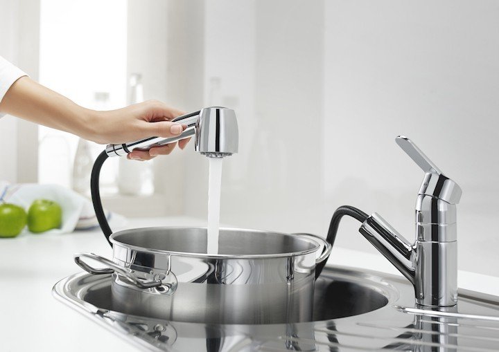 Baterie chiuvetă de bucătărie cu pipă rotativă retractabilă și funcție de pulverizare pentru clătire.