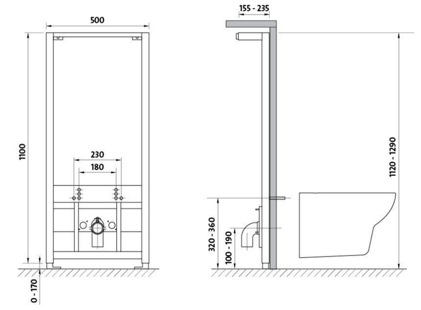 Cadrul este echipat cu un cot de ieșire care permite ajustarea inferioară sau laterală a acestuia, precum și manșoane de conexiune din alamă pentru supapele unghiulare. Acest model face posibilă ajustarea înălțimii racordurilor de apă-canal.