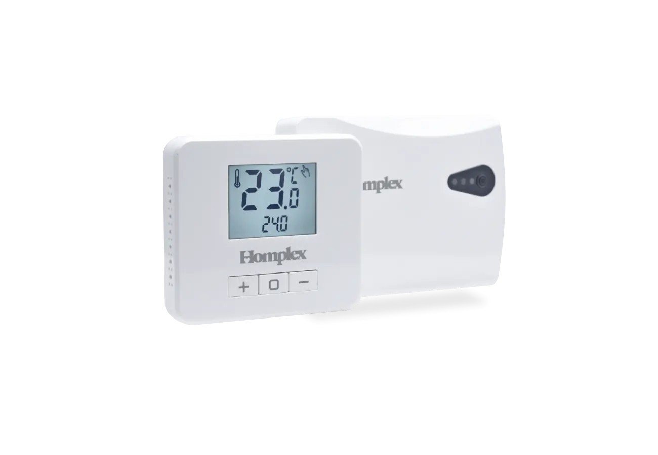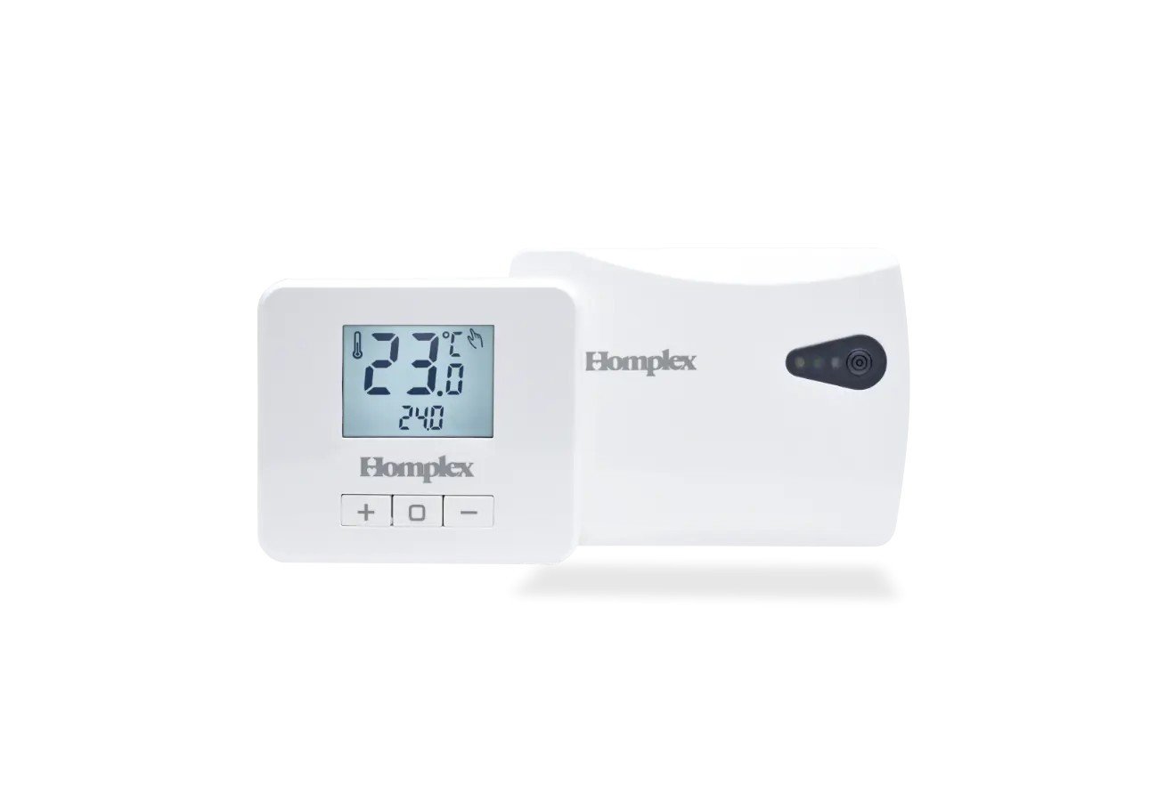 Termostatul neprogramabil Homplex EVO X RF poate funcționa împreună cu centrala termică sau cu instalația de încălzire în pardoseală (electrică). Acesta poate fi poziționat oriunde în locuință datorită comunicării prin radiofrecvență cu receptorul inclus în pachet.